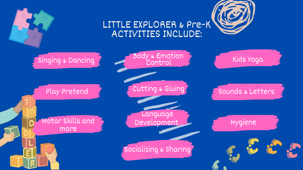 The program emphasizes exploration-based learning, where toddlers develop language, motor, and social-emotional skills through sensory play, cooking, dramatic play, and movement. It nurtures curiosity and builds confidence through discovery.